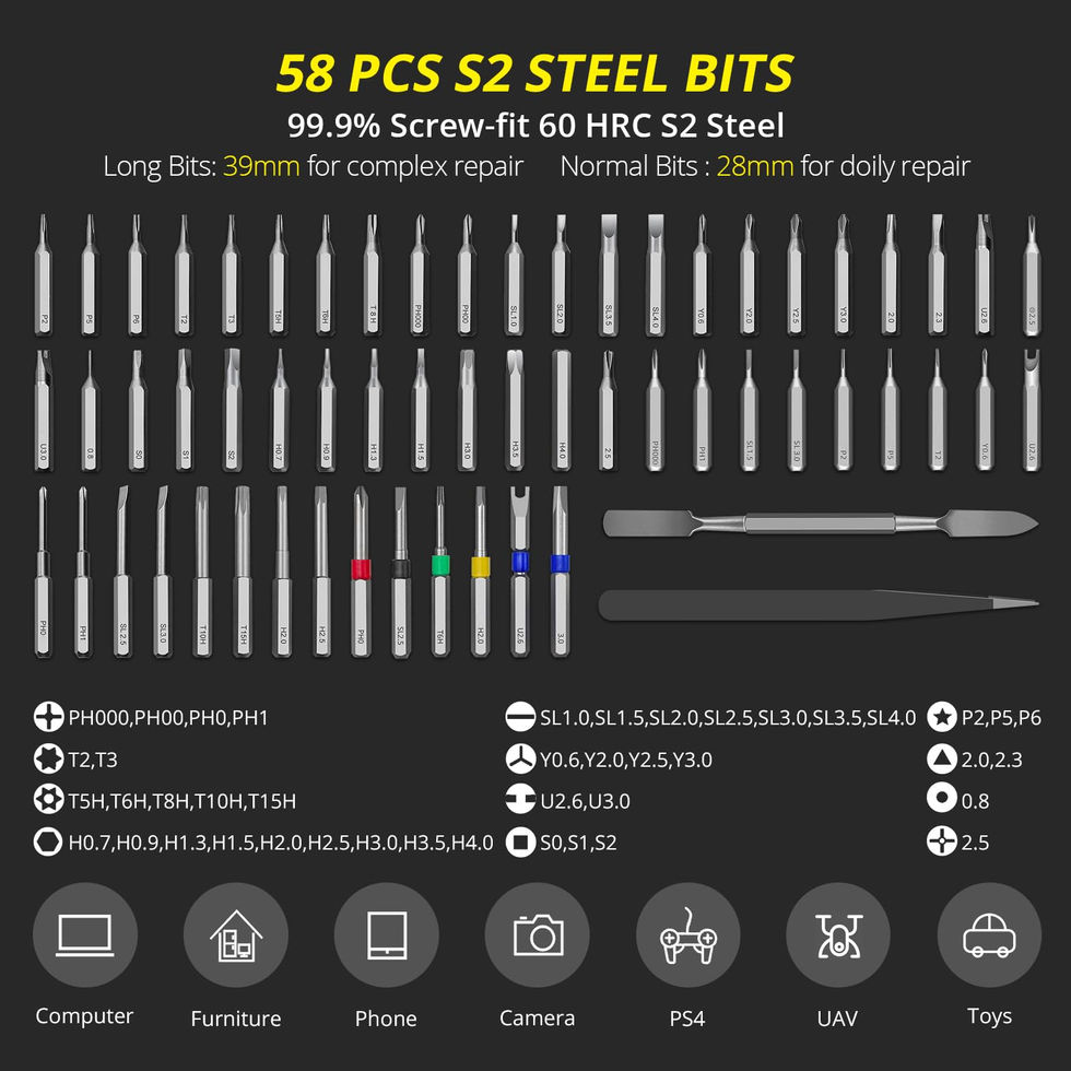 Note: The torque of electric screwdriver 5 gears is too large, it is not recommended to use 5 gears of torque to screw precision objects. Aluminium Alloy PRECISE TORQUE: This exquisite electric screwdriver is equipped with 5 speeds adjustable torque minimum torque 0.2 Nm, maximum 0.5 Nm, and 3 Nm manual torque, which provides precise torque to meet your work needs. Suitable for tablets, cell phones, watches, electronic bracelets, cameras, precision instruments and more. 58 IN 1 METAL DRILLS: Mini power screwdriver has 58 bits in 16 categories and comes with 2 boxes of portable drills for a variety of repair tasks.S2 Hardened steel ensures a long and safe service life. Quality tools for quality work. Everything in A Magnetic Case: Comes with a magnetic case that keeps the electric screwdriver and 58 metal bits orderly in a place. The pop-up mechanism brings you satisfying sensation for every open and close of the case. The chuck and bits are both magnetic for easy attachment.