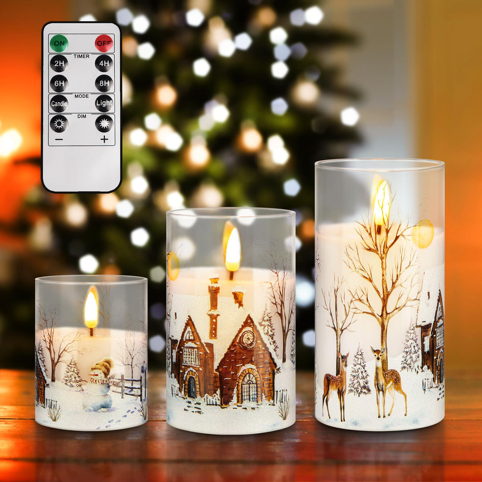 CHRISTMAS DECALS DESIGN -This beautiful christmas sticker candle is made up of cute snowmen, elk, and a warm home.Create festival and cozy atmosphere, ideal for Christmas party and winter decoration.and more importantly, the additional candle mode will randomly change the brightness, and the realistic flame technology creates a real and realistic visual effect flame. THE PERFECT CHRISTMAS DECORATING -These impressive candles require 3AAA batteries(not included) per candle, that are expected to last for about 150 hours, while the lifetime of the led lamps is up to 50,000 hours. This decorative Christmas tree candle is very nice addition to mantelpiece, fireplace, window sill, wall sconce, christmas tree around,add sweet and romantic ambiance to your winter decoration. REMOTE CONTROL FUNCTION -You can control these candles remotely when they are placed somewhere difficult to touch. Set a 2H/4H/6H/8H timers will save your trouble to turn them on/off because they will come back on automatically at the same time every day. Also, you can adjust the light modes(flicker/steady glow) and brightness level as you want. SAFE TO USE -These flameless candles can be used without having to worry of flame, no fire hazards or burning risks, safe for families with child or pet. With amazing flameless candle set you can have perfect ambient evenings with peace of mind. WONDERFUL CHRISTMAS GIFT CHOICE -You will receive 3 flickering candles(D3"x H4"5"6") and 1 remote control. A wonderful gift to express your love and concern to your family, lover, friends, and teacher. Especially on birthdays, anniversaries, Christmas, weddings, and other meaningful day.