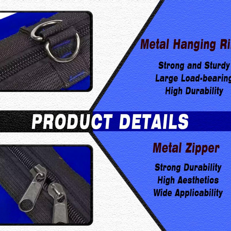 Material Characteristics: Color: Dark Blue. High quality 1680 double layer thick Oxford cloth, which is wear-resistant; scratch resistant; tear resistant; waterproof, and has a long service life. The overall size is 22L x 9.84H x 8.66W inches Structural Features: Large capacity. Open top double zipper. A total of 17 pockets of different sizes. Built in 11 small pockets of different sizes, suitable for holding tools of different sizes. There are 6 pockets on the outside. Includes: 3 Velcro pockets and 3 open pockets. More tools can be stored to make storage more convenient, easy to classify and manage Carrying Method: Equipped with an extended and widened shoulder strap. It has adjustable features and is suitable for most people to wear. Featuring a thickened and widened handle design, it can reduce hand pressure and friction. Enhance user comfort. The connection is equipped with a metal ring mouth, which can be carried from multiple angles Metal Zipper: Bidirectional metal zipper. Made of high-quality materials. Not easily damaged. The connection between the zipper and the tool kit is sewn in a special way. Not easily torn or damaged. Durable service life Multiple Occasions: The bottom is equipped with rubber anti slip design, which can increase the stability of the tool kit. Suitable for survival in various harsh environments. Very suitable for storing various professional maintenance tools, used for electrical, plumbing, woodworking, automotive, home DIY, etc
