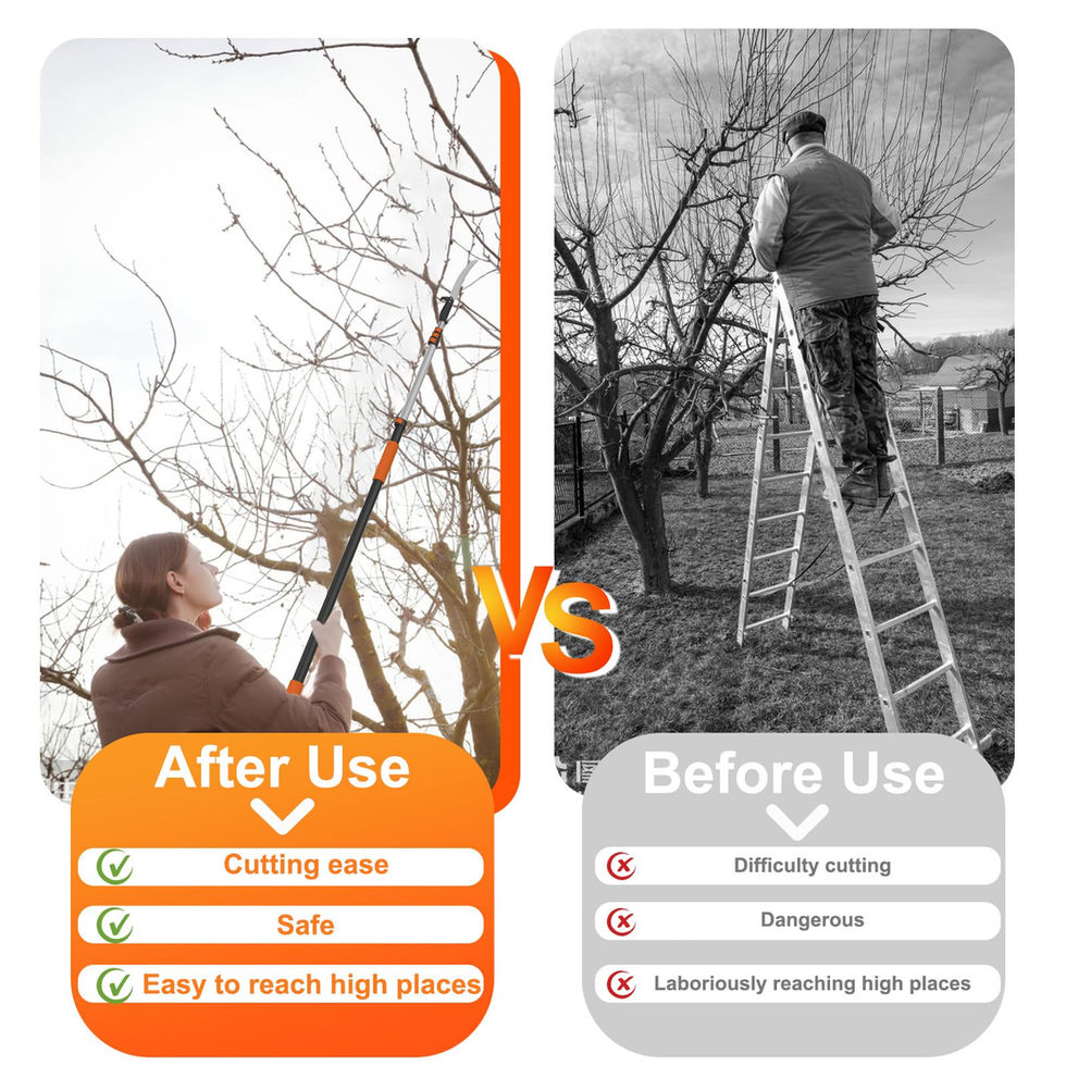 Ultra-Adjustable Range for Versatile Use: Our manual pole saw equipped with a 5-20FT telescoping aluminum pole, allowing the pole saw to easily reach high places. As tree pruner extendable,it is perfect for trimming high branches, low shrubs, and tree trunks alike. Stable Lock Design for Safety and Durability: This tree saw with pole is designed with a safety locking joint, ensure the telescoping pole saw is stable and not shaking when in use, strong load-bearing capacity, no need to worry about the pole body bending or breakage.Additionally, the lightweight design of this pole pruners for tree trimming ensures long hours of operation without fatigue, making it ideal for tree trimming. Sharp Blade for Efficient Cutting : Our tree trimmer pole saw blades are made of high quality carbon steel, precision ground and specially coated for unmatched sharpness, corrosion and wear resistance. The unique hook knife design easily removes tangled branches, Allows people to improve pruning efficiency when using pole saws for tree trimming. Comfortable Grip for Safe Handling:The grip is made of insulating material with an anti-slip design, ensuring stable holding even in wet conditions. The pole pruner's connection to the telescoping pole uses a reinforcing screw to secure the saw head to the pole, preventing loosening and potential injury.Our pole saws for tree trimming allows you to safely prune high branches from the ground, ensuring you have a beautifully manicured garden. Universal Design of Telescoping Manual Pole Saw: The universal fitting of the telescoping pole allows for compatibility with various saw heads. This feature enables you to utilize our manual pole saw for a wide range of overhead or hard-to-reach cutting tasks, especially when paired with a long-handled saw head, making it a standout in a professional tree pruner, particularly suited for landscapers or homeowners needing to prune high branches.