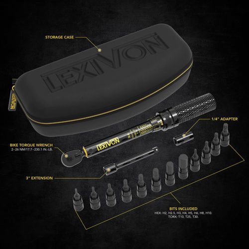 THE ULTIMATE BIKE TOOL - This 15-Piece bicycle torque wrench features precise scales of 2~26 Newton Meter (17.7~230.1 in-lb) with micro-adjustments to 0.2 Nm. Includes bit sockets: HEX - H2, H2.5, H3, H4, H5, H6, H8, H10. TORX - T10, T20, T25, T30 | 3-inch Extension bar & 1/4-inch Adapter. 72-TOOTH GEAR - Reinforced, Hardened & Heat-treated ratchet head; constructed from Chrome-Molybdenum alloy steel. The Quick-Release Button Mechanism allows secure fit as well as rapid socket swap. PRECISION - This Dual-Direction bike tool torque wrench ships pre-calibrated and measures torque in both CW (+/- 4%) and CCW (+/- 6%). Includes calibration certificate with traceable & unique serial number. This bike multitool ensures that bolts and nuts are tightened to the correct torque, increasing longevity and preventing damage from over-tightening. DURABLE - Rust & corrosion protection with unique and newly invented Electro-Black finish treatment. A non-slip knurled handle made of high-grade aerospace aluminum, equipped with our exclusive slide-to-lock mechanism to set your desired torque. PERFORMANCE - Features an easy-to-read, highlighted yellow print, dual-range scale; identify the markings even in low-light conditions. Unlike other bike torque wrenches, our proprietary easy-to-rotate handle reduces efforts & prevents hand fatigue by up to 62%