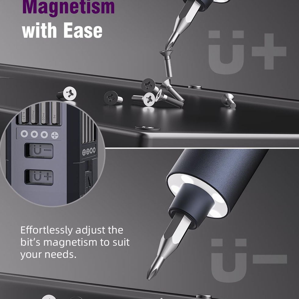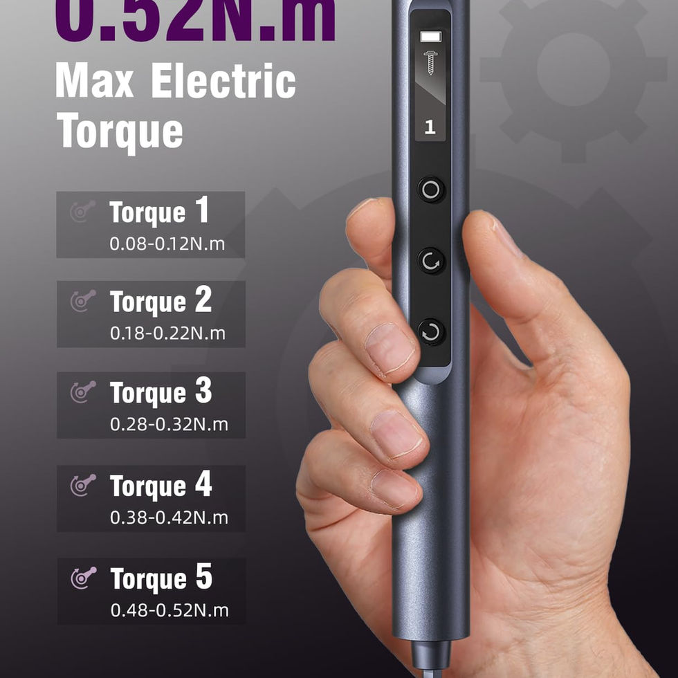 【User-friendly Design】:The LCD screen allows you to observe usage at all times. Four automatically turned-on LEDs provide excellent visibility and can easily handle low-light environments. The screwdriver's grip is coated with a non-slip coating on the outside, taking care of your experience in detail. The product comes with a magnetizing/demagnetizing function area, you can adjust the magnetism of the screwdriver bit according to your needs during use. 【Precision Torque Setting】: Our high-performance electric screwdriver offers 5 adjustable electric torque settings from 0.1N·m to 0.52N·m, and along with a manual torque mode of 3 N·m. This mini electric screwdriver provides users precise control when they adjust torque based on different materials and screw requirements. 【Powerful Performance】: Our lightweight electric screwdriver is equipped with a 500mAh Li-ion battery that can efficiently drive up to 2,000 screws on a single full charge. You can say goodbye to battery life anxiety during use this electric screwdriver. The motor part of the screwdriver runs at 200RPM, making each screw rotation a breeze. Meanwhile, the Type-C charging port makes charging fast and hassle-free. 【42-in-1 S2 Screwdriver Bits】: 42-in-1 precision electric screwdriver set includes 34 pieces of 28mm normal bits and 8 pieces of 39mm long bits to handle screws of different depths.12 types of screwdriver bits can meet your various needs of assembly, disassembly and repair, such as computer mainframes, iPads, watches, cameras, drones, eyeglasses and so on. The all-in-one design saves you space and time searching for tools. 【What's In The Box】:Electric Screwdriver*1, Precision S2 Bits*42, Type-C Charging Cable*1, Magnetic Storage Case*1, Tweezer*1, Pry Bar*1, User Manual*1. Please note that the charging head is not included.