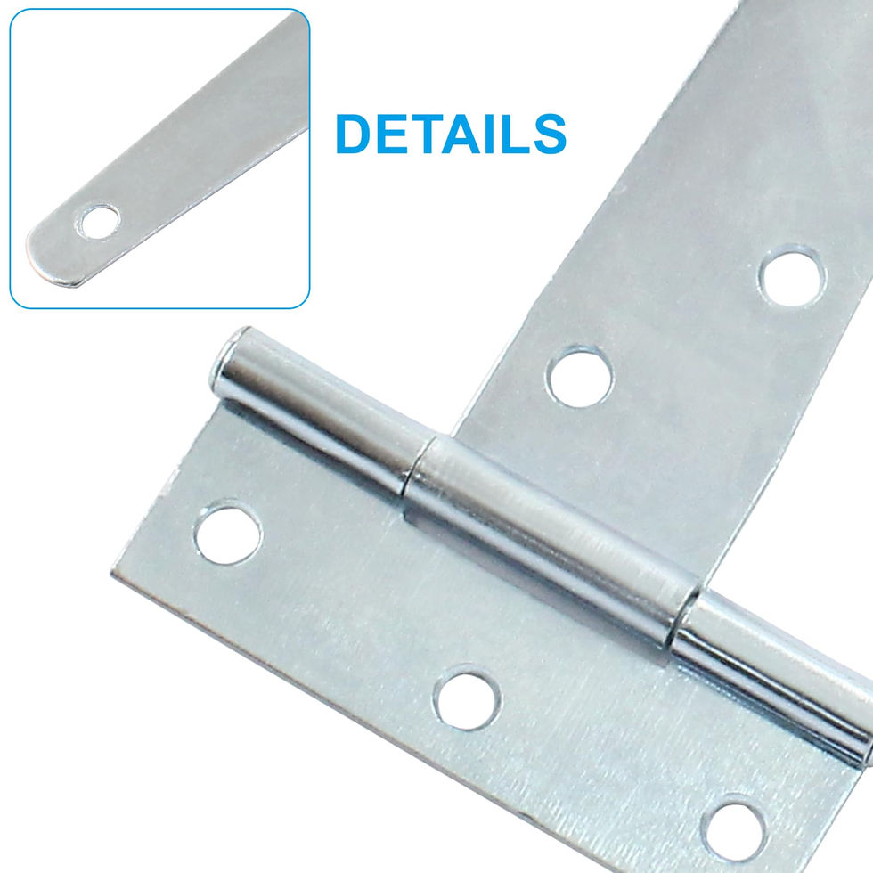【Inclusive Package】Your purchase includes a comprehensive package containing 6 robust 6" heavy-duty hinges and a generous quantity of 42 accompanying wood screws. This ensures that you have all the necessary hardware to facilitate a seamless installation process. Durable Material - The hinge of the shed door is made of solid iron material, and the surface is galvanized, which is strong, firm, rust-proof, durable, and not easy to bend. Easy To Use - The outdoor hinge adopts a T-shaped hinge design with 6 positioning screw holes, which is convenient for installation and stable. T-shaped Design - T-shaped design makes opening and closing more convenient, eliminating metal-to-metal contact and smoothly. Widely Application - T-shaped hinges with shutter can be used for heavy-duty applications that can withstand a weight of approximately 50 pounds. Widely used in various outdoor and indoor buildings, such as shed doors, barn doors, vents, goat barns, shutters, fences, skylights, playrooms, animal shelters, especially suitable for cabinets and small projects.
