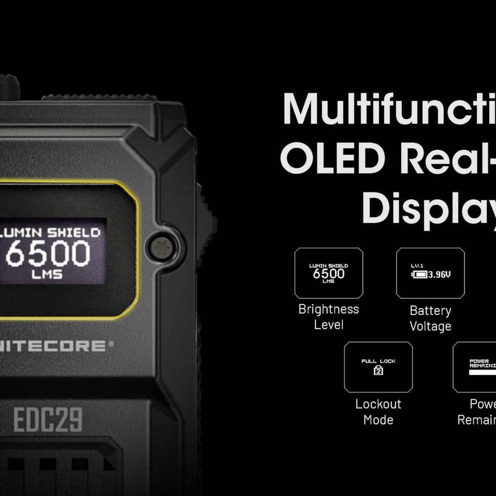 SUPER BRIGHT FLASHLIGHT - The Nitecore EDC29 is an ultra high-performance flashlight capable of 6500 lumens and a max beam throw of 437 yards. VERSATILE OUTPUT MODES - Support spotlight, floodlight, and strobe modes with 6 brightness levels and digital display of outputs and status. You can even customize the controls to suit your needs best. FLAT SHAPE EDC FLASHLIGHT - Designed to be easily carried in a pocket, the EDC29 is only 0.76 inches thick and weighs 5.64 oz. Comes with two lockout modes to ensure quick access to key functions and safety. USB-C RECHARGEABLE - fully charged in 1 hour and 15 minutes with a runtime of 61 hours on its low mode. CONTAINS - Nitecore EDC29 flashlight, Lanyard, USB-C charging cable and Nitecore Sticker