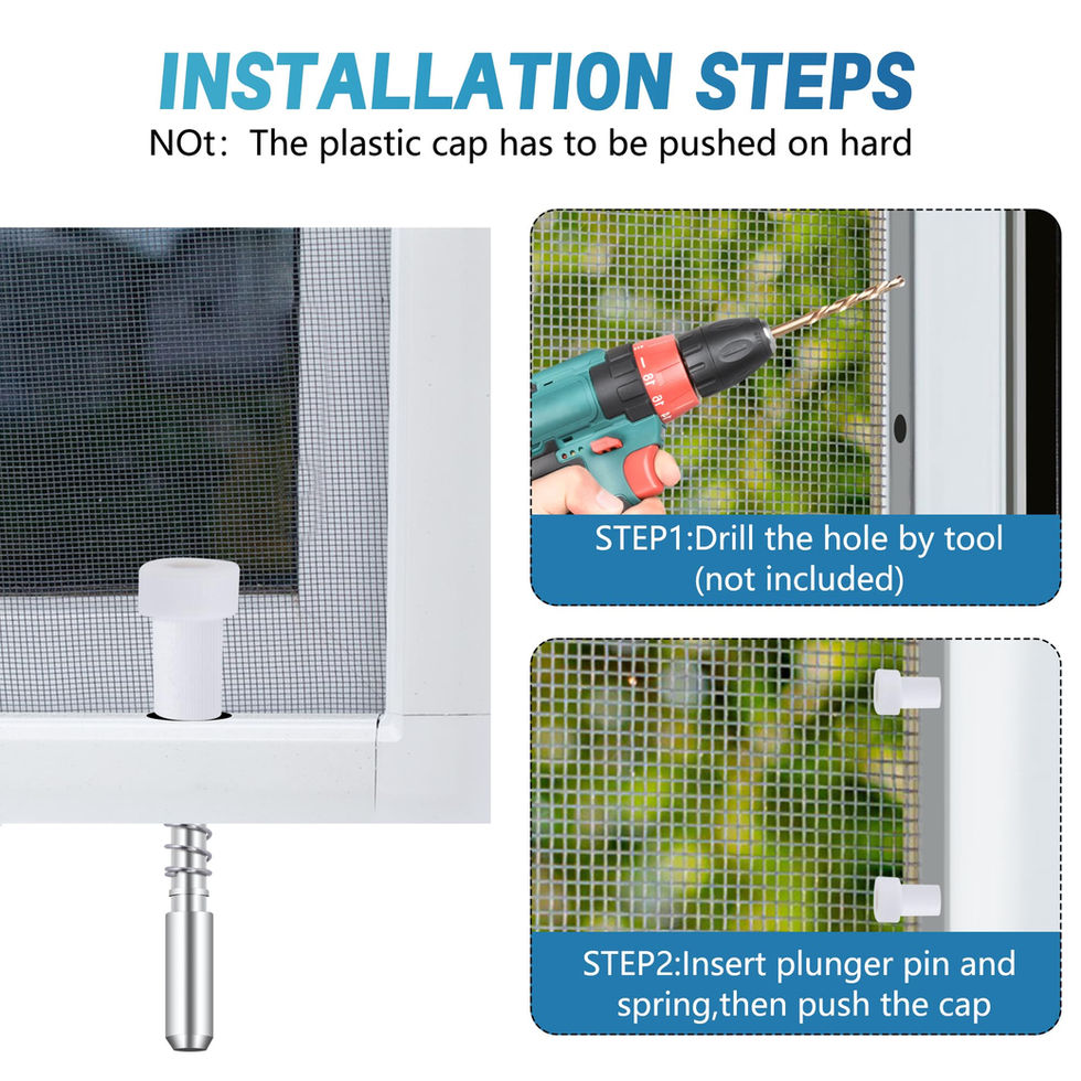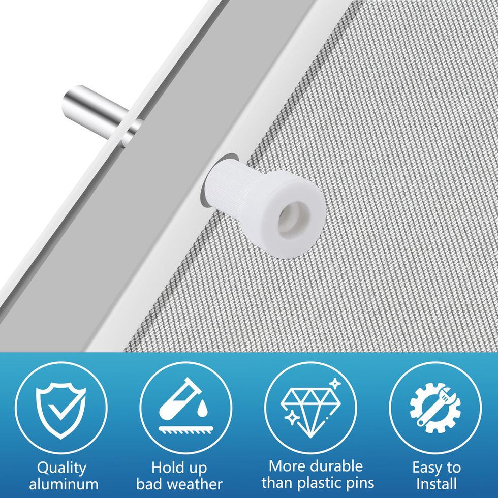Plunger latche set:You will receive the window screen plunger latches with 30 white caps, 30 springs and 30 aluminum pins. The pins are 1-1/2 inches long by 5/32 inches wide, easy to install and fit most screens. Fixed screen:The window screen replacement pins hold your window screens in place, ensuring that your screens remain in place and functional even after years of exposure, and are ideal for fixing window screens. Premium material:Made of high quality aluminum alloy, our window screen retainers are strong, reliable, unbreakable, and built to last for years of use, , keeping you away from fragile plastic replacement kits. Easy to install:Our pins are easy to install and fit perfectly, simply slide the spring onto the pin and with a gentle push, the white cover snaps closed, providing a convenient and cost-effective solution for replacing worn out pins. Reliable fit:Featuring a simple push-in design for quick installation without special tools or expertise, these window screen plunger latches easily snap into place to hold screens securely in place for window screens or other fastening needs.