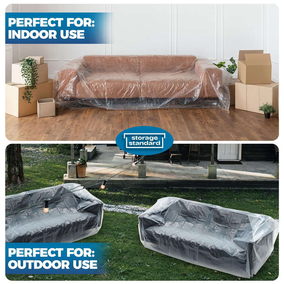 Easily Protect a Couch - Keep your couch free from dust, stain, & dirt with our plastic couch cover for moving! It keeps furniture pristine during transit when moving or storing furniture in your shop. Durable & Reusable Cover - Made from heavy-duty plastic with a 4-mil thickness, our extra-thick plastic covers for furniture boast a waterproof construction to ensure your couch or sofa stays protected from moisture, drizzle, or splash. Large Size to Fit Large Furniture - Our couch covers protector measures 96" x 42" x 62" when open & 96" x 42" x 41" when sealed with tape. It fits a couch, sofa, & other large furniture up to 92'' long. Can be used both indoors & outdoors. Easy to Use for Stress-Free Packing - With the clear material of our plastic cover furniture sofa cover bag plastic wrap, you can quickly identify items! The included 2 sticker labels let you display prices or label. For Home or Commercial Use - Renovating your home or displaying furniture in your shop? You need our protective couch cover to wrap furniture! Click 'Add to Cart' today to add Storage Standard to your supplies.
