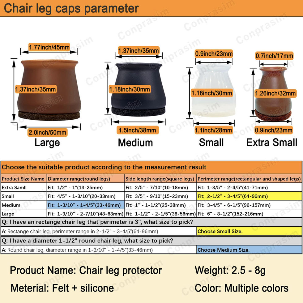 {Small Silicone Furniture & Floor Protectors} Newly designed taller thicker silicone chair leg floor protectors as a new partner of chair legs, nice snug fit, These chair leg caps protectors can effectively protect hardwood floors, smooth sliding, no scratches and no more screeching noises.Your floors will thanking you. {Eco Friendly& Durable} 24 x Furniture silicon leg covers protect your chair legs and floor from damage, no gel, no nails. 100% made from food grade silicone, combine the felt and the silicone into one inseparable piece, durable, nontoxic, safe for children & pets.Furniture will restore to its original condition after disassembling leg caps, no damage. continue use leg cover at new place, super sturdy, no waste of money. {Fit to Round and Square Legs} small size silicone furniture leg caps stretchable to fit round, square, retangle, irregular, odd shaped furniture legs. Please MEASURE the leg size before purchase to save time! Recommended Size: Round Leg Diameter Size 4/5" - 1-3/10"; Square Leg Side Size 3/5" - 9/10"; Other Leg Shapes with Perimeter size 2-1/2" - 3-4/5". {Fit Small Size Furniture Feet} These chair feet protectors fit many typle furniture feet, such as: dining room chair, bar stool, patio chair, kitchen chair, metal bistro chairs, desk chair,restaurant chairs, etc. {Chair Leg Caps Easy to Install } Soft silicon protector is stretchable, lightweight and easy to put on and hold tightly, grip and fit is perfect, put it on directly to use, no tools needed, no chair foot cleaning needed. (please watch the video)