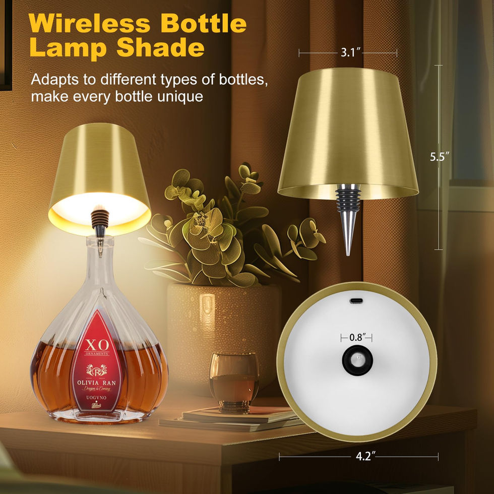 TOUCH DIMMABLE WIRELESS BOTTLE LIGHT: This wireless light is available in three colors, allowing you to create the perfect ambiance for any occasion. DIY BOTTLE LIGHT DESIGN: It adopts the most versatile conical lampshade design. You can freely choose different bottles as the base, such as beer bottles, wine bottles, whiskey bottles and so on. PORTABLE CORDLESS TABLE LAMPS: Cordless table lamps are made of the best quality metal, living room cordless lamps; suitable for home and public places (indoor and outdoor). It can be used for reading, creating atmosphere, outdoor table lamps can be used in bedrooms, living rooms, bars, restaurants and terraces, etc. RECHARGEABLE LED TABLE LAMPS: Simple and classic LED cordless table lamp blends retro and stylish charm. The low-power, battery-powered night light is the first choice for emergency power and can be easily recharged via the USB-C port, making it very environmentally friendly. GREAT GIFT: The Cordless Bottle Lamp is a thoughtful gift for friends, family or co-workers who appreciate stylish home décor and multi-functional lighting solutions, and a must-have for everyone's decorative collection, bringing your favorite bottles back to life and bringing a unique and elegant design to your home.